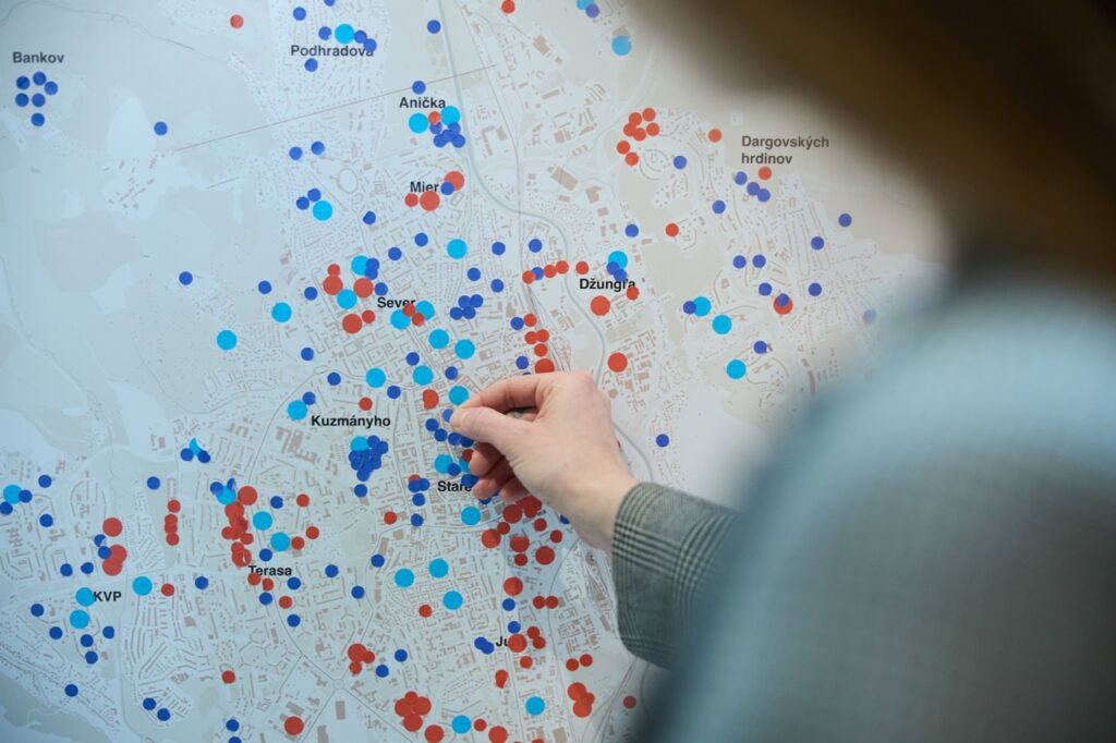 Sprievodnou aktivitou bola aj pocitová mapa mesta, do ktorej návštevníci zaznamenávali svoje pozitívne a negatívne vnímanie jednotlivých lokalít. Táto forma zberu dát poukázala na to, že mesto nie je len súbor objektívnych parametrov, ale aj priestor osobných skúseností, emócií a často aj sprostredkovaných predstáv.